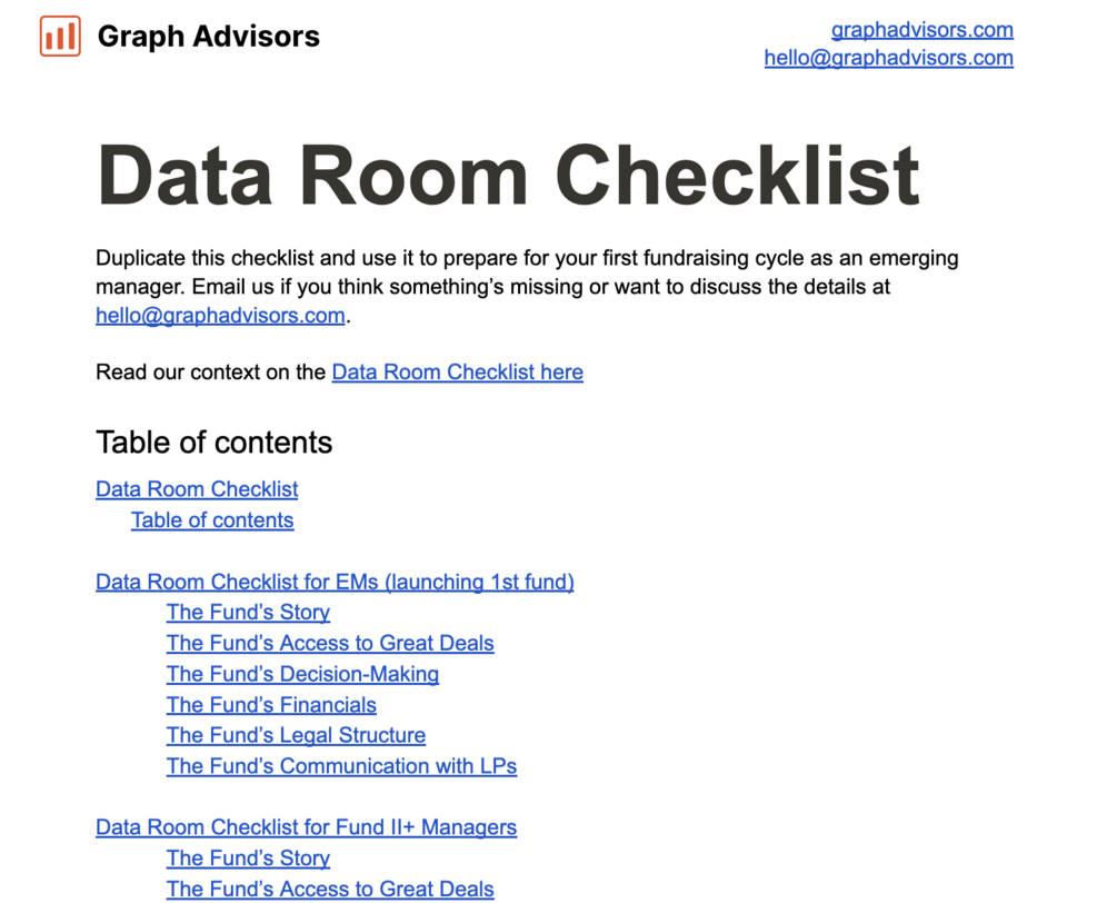 A free Google Doc or Notion Page template and checklist for Data Rooms for VCs and Emerging Managers